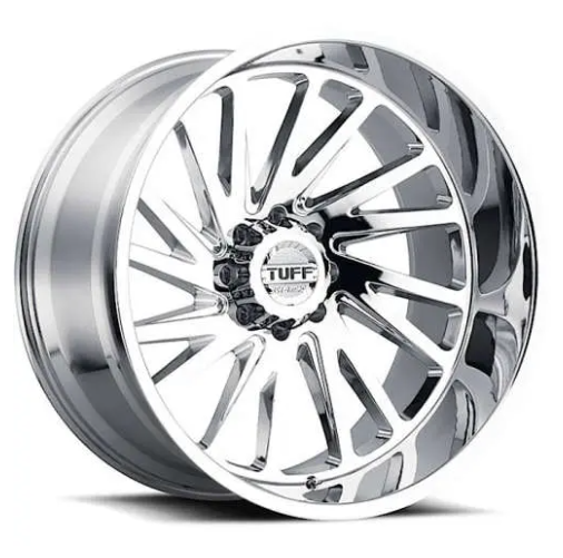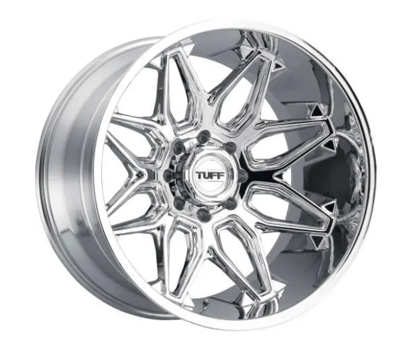 These Tuff T3B wheels feature a Chrome finish and are sure to make your ride stand out! This particular wheel setup is in 26×14 with a -72 offset. The Tuff T3B is a One Piece Alloy wheel that features exposed lugs. These beautiful 8 spoke wheels are available in a 6×5.5 configuration and will be sure to elevate the look of your vehicle build!