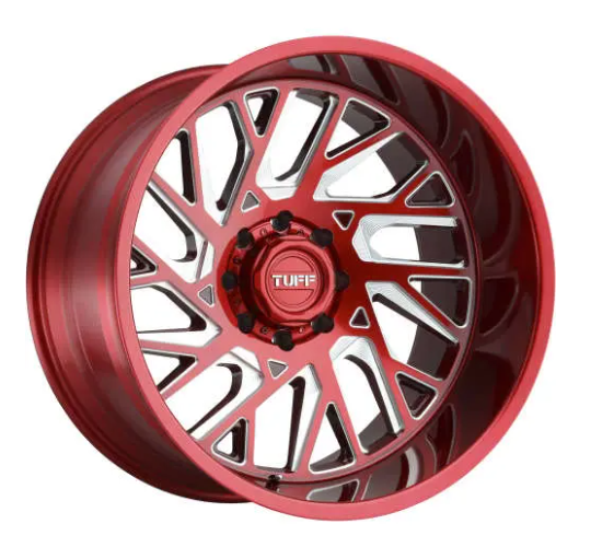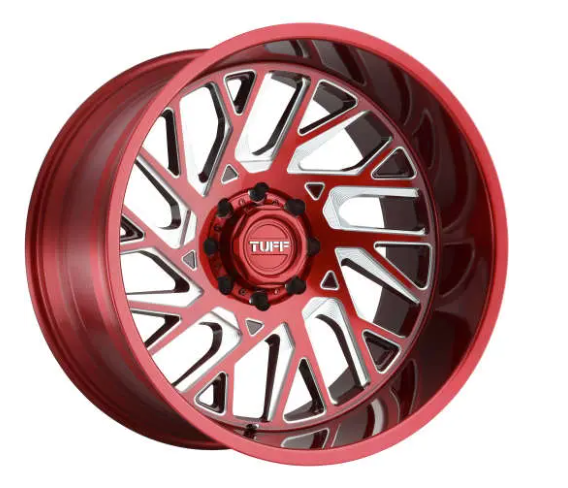 These Tuff T4B wheels feature a Red finish and are sure to make your ride stand out! This particular wheel setup is in 24×14 with a -72 offset. The Tuff T4B is a One Piece Alloy wheel that features exposed lugs. These beautiful 10 spoke wheels are available in a 5×5 configuration and will be sure to elevate the look of your vehicle build!